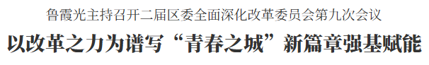 8月19日上午,二屆區委全面深化改革委員會第九次會議暨高質量發展推動共同富裕領導小組例會召開。市委常委、副市長、區委書記、區委全面深化改革委員會主任魯霞光強調,要深入學習貫徹中央和省委、市委關于全面深化改革、推動共同富裕的部署要求,提速奔跑,擔當作為,以改革之力為譜寫“青春之城”新篇章、打造高質量發展建設共同富裕示范區區縣樣板強基賦能。