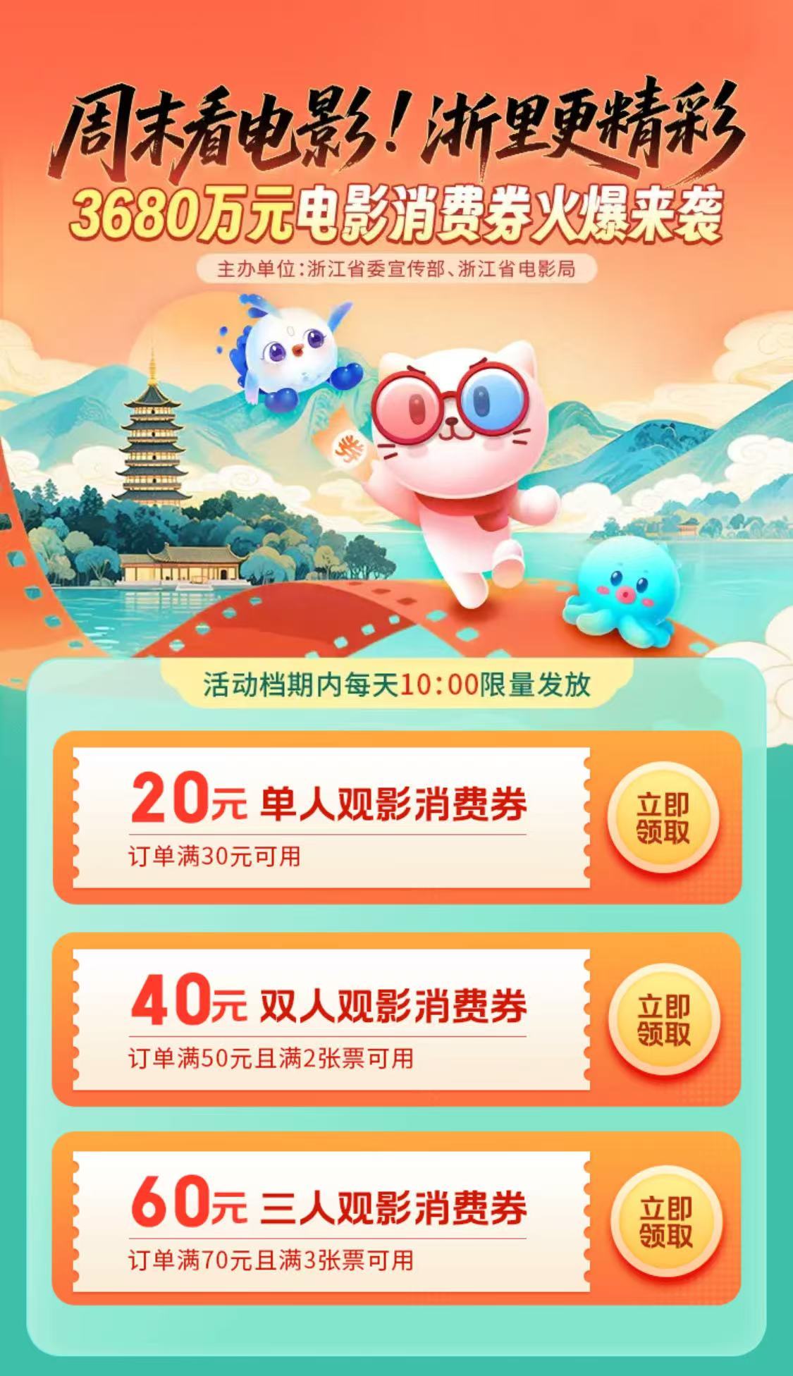 本輪消費(fèi)券包括20元單人觀影消費(fèi)券、